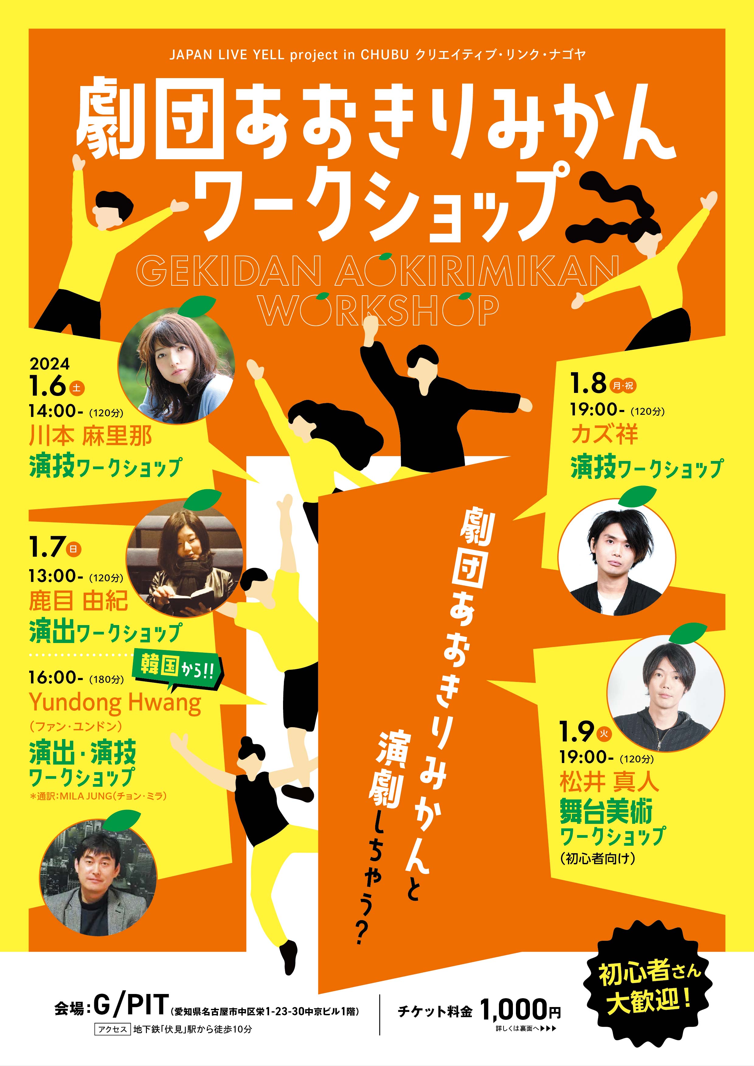 演出については、あおきりみかんの主宰でもある鹿目由紀と、韓国で活躍されている演出家のYundong Hwang(ファン・ユンドン)さんが異なるワークショップを開催します。国による演出の違いや、国は違っていても共通している部分、それぞれがどんなアプローチで作品に取り組んでいるかなどを体験していただければと思います。