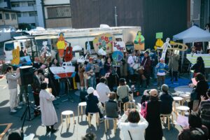 ミュージシャンのテライショウタさんがつくった曲を地域のみなさんが合唱したり、アーティストの宮田明日鹿さんと地元の方がともに編み物をする場をつくる「港まち手芸部」のブースがあったりと、地域の温かみと、他の地域から来た人も楽しめる居心地のよさが同居した、稀有な場になっています。