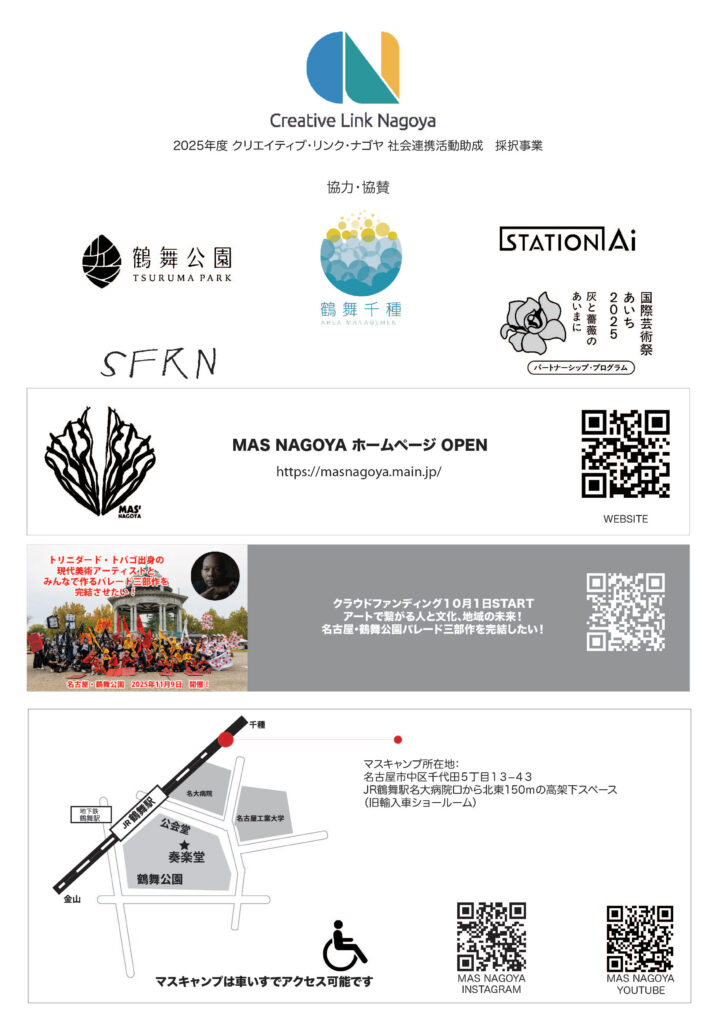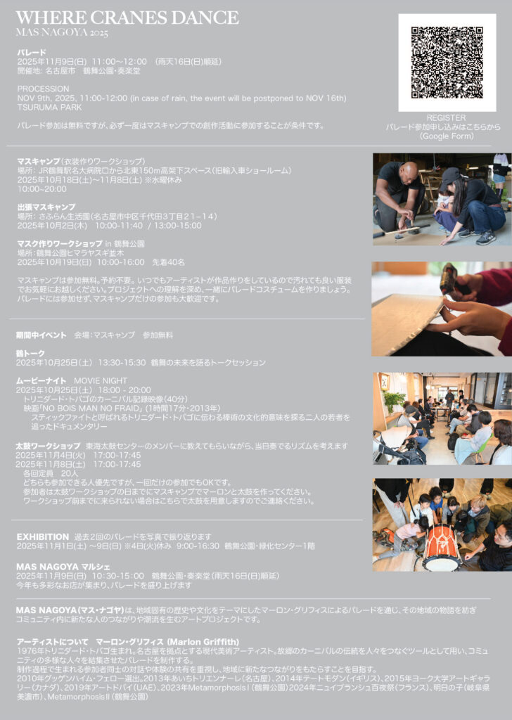 現代美術家マーロン・グリフィスが地域と共に創る、鶴舞をテーマにしたパレードの第3弾。パレード参加者は衣装づくりワークショップ「マスキャンプ」にも参加する。そのほか地域主体のお祭りでのプレイベントや出張ワークショップも開催。地域の多様な人々をつなぐプロジェクト。