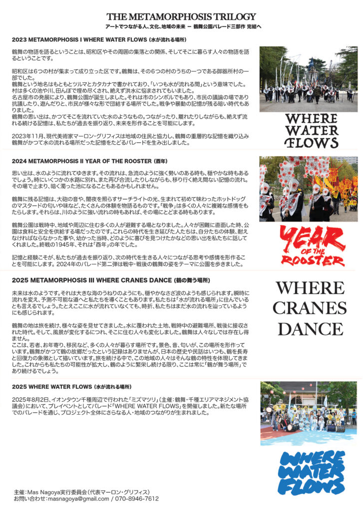 2023年、2024年と続けて取り組んできた鶴舞公園三部作「METAMORPHOSIS(メタモルフォシス)」の最終章として、2025年11月9日に鶴舞公園でパレードを開催します。これに先立ち、公園近くでは一定期間にわたり「マスキャンプ」と呼ばれる創作の場を設けます。このマスキャンプでは人々が自由に行き来して交流し、地域の歴史や文化に触れ、鶴舞という地域についてより深く知りながら、パレードで用いるマスクや衣装を制作します。過去二回の取り組みで築かれた地域との繋がりを踏まえ、今年は規模を拡大し、パレードの参加者数を100人とすることを目標としています。また11月の本番に先がけて、8月には鶴舞公園近くのイオンタウン千種で開かれた「ミズマツリ」と同じ日に小規模なパレードも行いました。