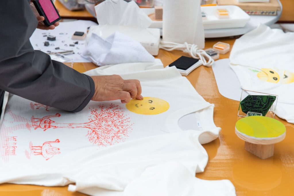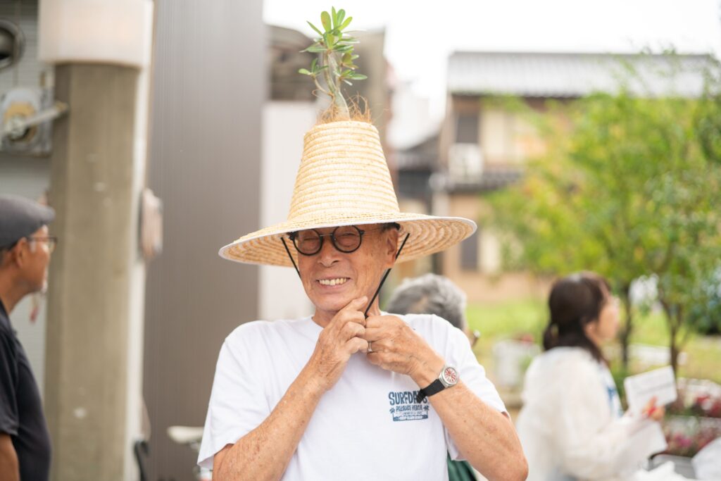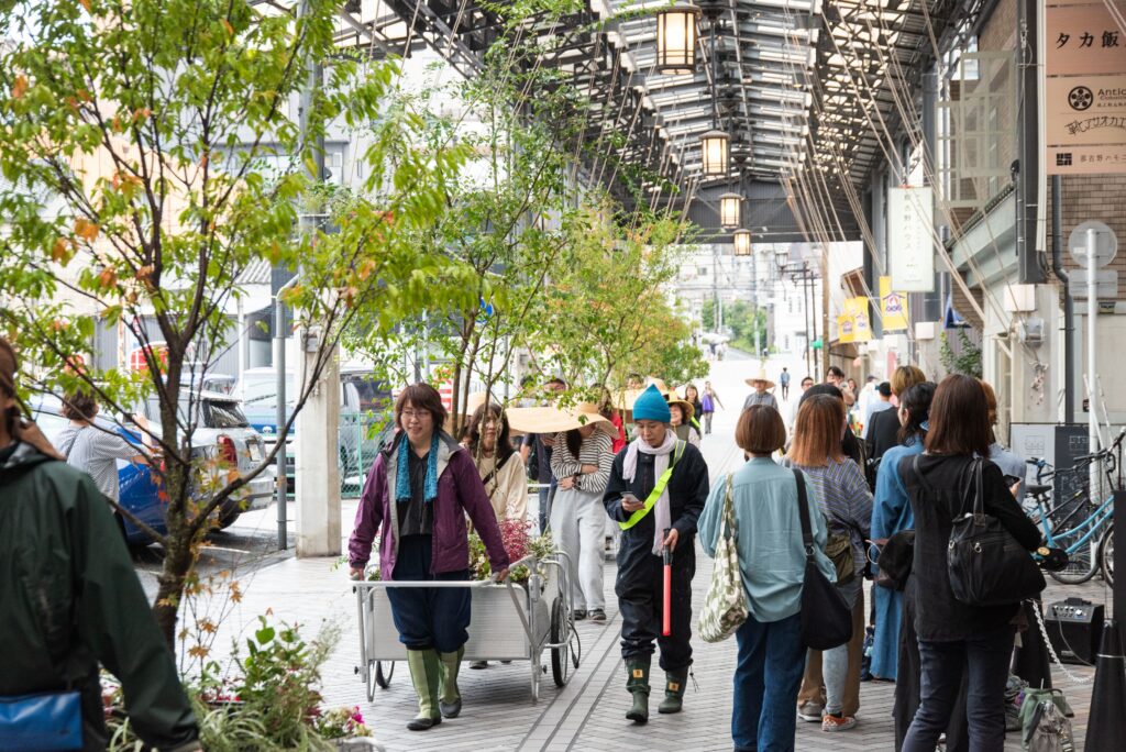 会場は円頓寺商店街の一角ということで、さて、どこかしらと歩いていると、早速、樹木を植え込んだ6台のリヤカーが並ぶ、ちょっと不思議な光景に出くわした。これがGreen Caravan(緑の隊商)の中心をなす「旅する木陰」だ。まわりにはすでにCommunisの矢田義典さんや道家洋さん、⽻柴順弘さん、ボランティアのみなさん等々が勢揃い。雨模様の空も気にせず、まずはみんなでリヤカーに様々な植物を植え込んで、色とりどりの庭を作ってみる。これが楽しい。時々、園芸の専門家、糟谷護さんからのアドバイスというか絶妙の講評?が入り、ますます賑やかに。やがて完成した植物満載のリヤカーを、今度はみんなで引いてみる(けっこう重かった…)。キャラヴァンよろしく隊列を組んで商店街を進めば、それはまさに「動いている庭」で、アーケードはそよぐ緑に彩られ、通りがかりの人々もみな笑顔に。加えて、わっと歓声も聞こえるのだが、これは隊列に加わった「Coかげぼうし」のおかげだ。簡単に言えば、4人でかぶる(日陰を分かち合うための)帽子なのだけれど、そのちぐはぐな一体感が想像以上に楽しい。私は蛸の足になった気分でふらふらしながら、他の6本の足(=3人のみなさん)とつながった。アーティストユニット「サンニン」(今村哲さん、染谷亜里可さん、鋤柄ふくみさん)の快作だ。「サンニン」は、この日はさらにTシャツに絵や文字を版で押すワークショップも手掛けて、イベントにつくる喜びを添えていた。
