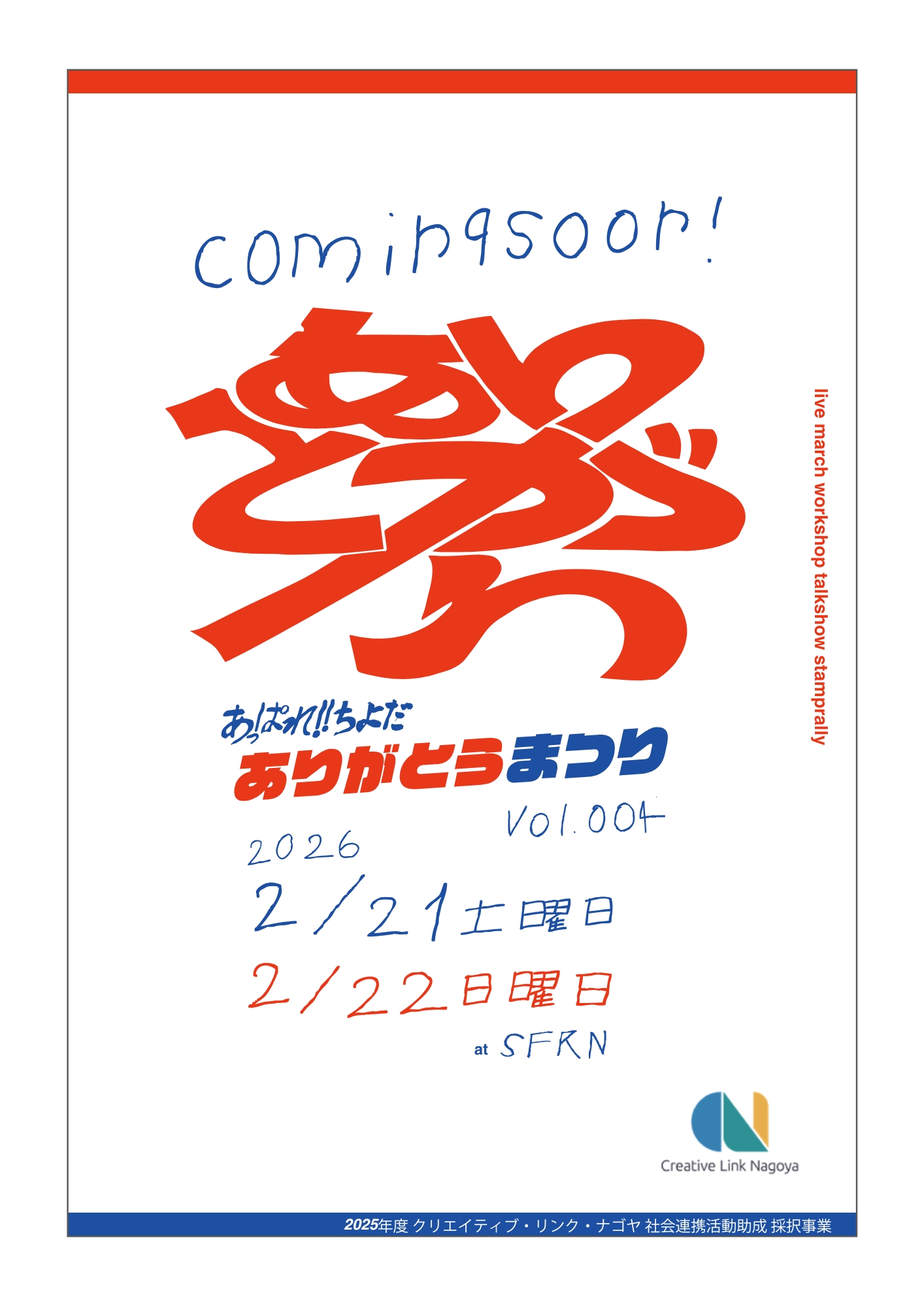 これから実施されるクリエイティブ・リンク・ナゴヤの社会連携活動助成採択事業や、キャリアアップ支援助成に採択された若手アーティストの活動をご紹介。また当組織の活動以外でも、名古屋市美術館や名古屋市文化振興事業団主催事業もピックアップしました。