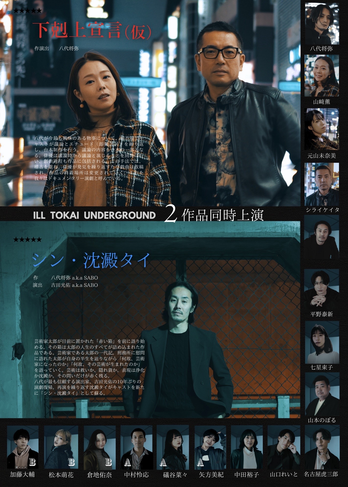 八代将弥さんが主宰するILL TOKAI UNDERGROUNDは劇団などの枠を越えて優れた作品を発信するユニット。彼らが新たなステージに挑みます。まず東京のシライケイタさん、山崎薫さんをキャストに迎えて新作を発表。さらに代表作を再創作し、同時上演します。嬉しいのは『シン・沈殿タイ』で吉田光佑さんが復帰すること。八代さんと吉田さんはかつて「SABO」名義で共作していて、私は10年以上前に彼らの劇団を見て衝撃を受けました。繊細な吉田演出の復活は本当に楽しみです。それにしても八代さんの実行力にはいつも感嘆します。日本演出家協会理事長のシライさんを口説いたことろから企画成立まで尋常じゃない根気や勇気が要ったはず。今いちばん熱い演劇人、八代さんの最新動向は見逃せません。