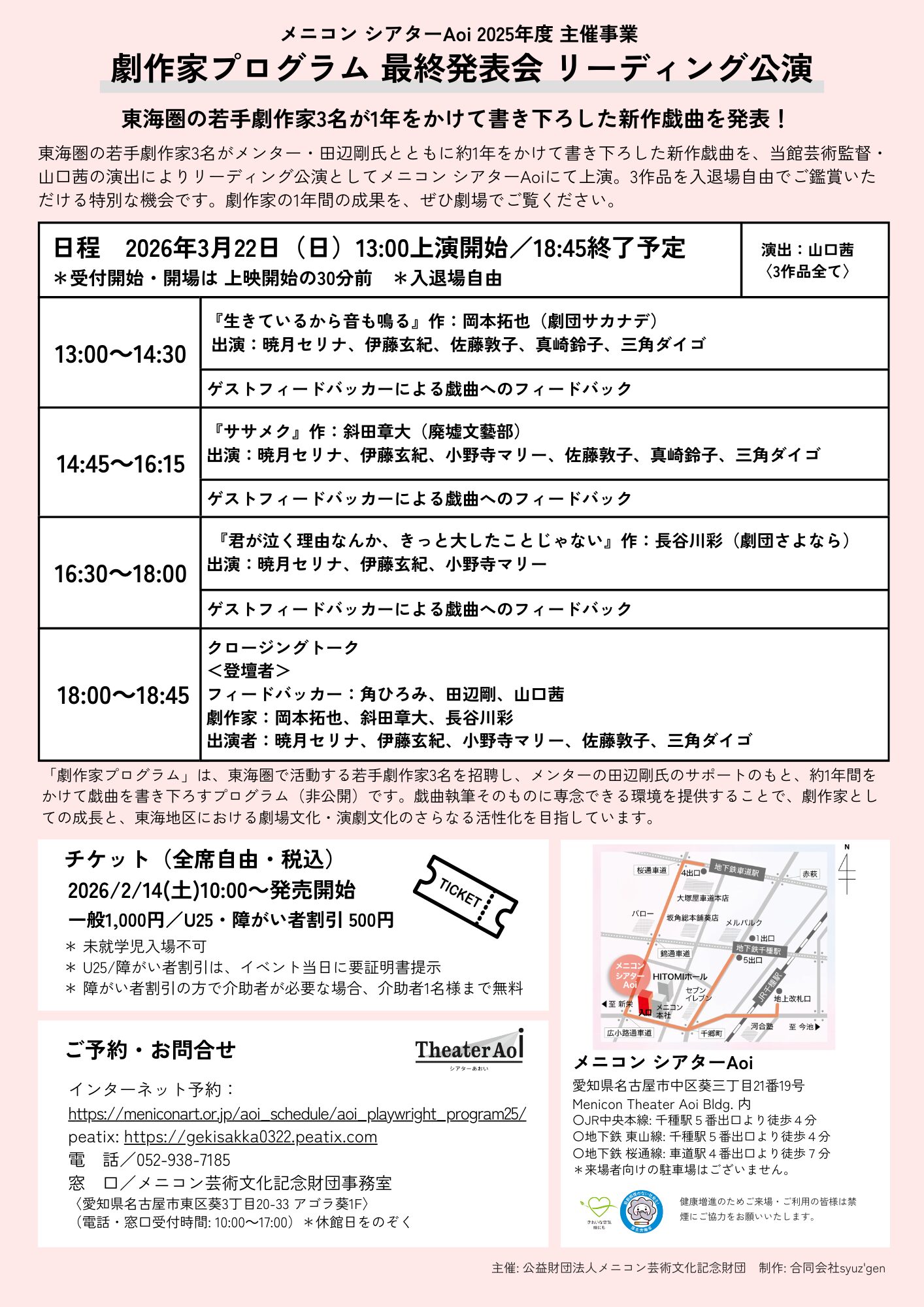 メニコン シアターAoi 劇作家プログラム リーディング上演
