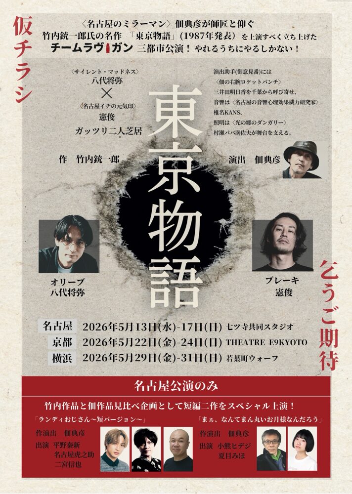 岸田戯曲賞作家の佃典彦さんが師匠と仰ぐ竹内銃一郎さんの1987年発表作『東京物語』を上演するためにチームラヴガンを立ち上げました。同作はタイトルからわかるとおり小津安二郎監督の同名映画が題材。そこにミュージカルでも知られるマヌエル・プイグの小説『蜘蛛女のキス』の要素も加わり、同性愛者の男オリーブと革命家ブレーキの会話が繰り広げられるという、引用上手の竹内さんらしい二人芝居です。佃さんはもちろん演出を手がけ、オリーブ役に八代将弥さん、ブレーキ役には憲俊さんが配されました。名古屋をけん引する俳優ふたりが佃演出のもと、がっぷりと四つに組むのは見モノ。なお、佃さん自身の作品を味わえる短編の特別上演もあります。