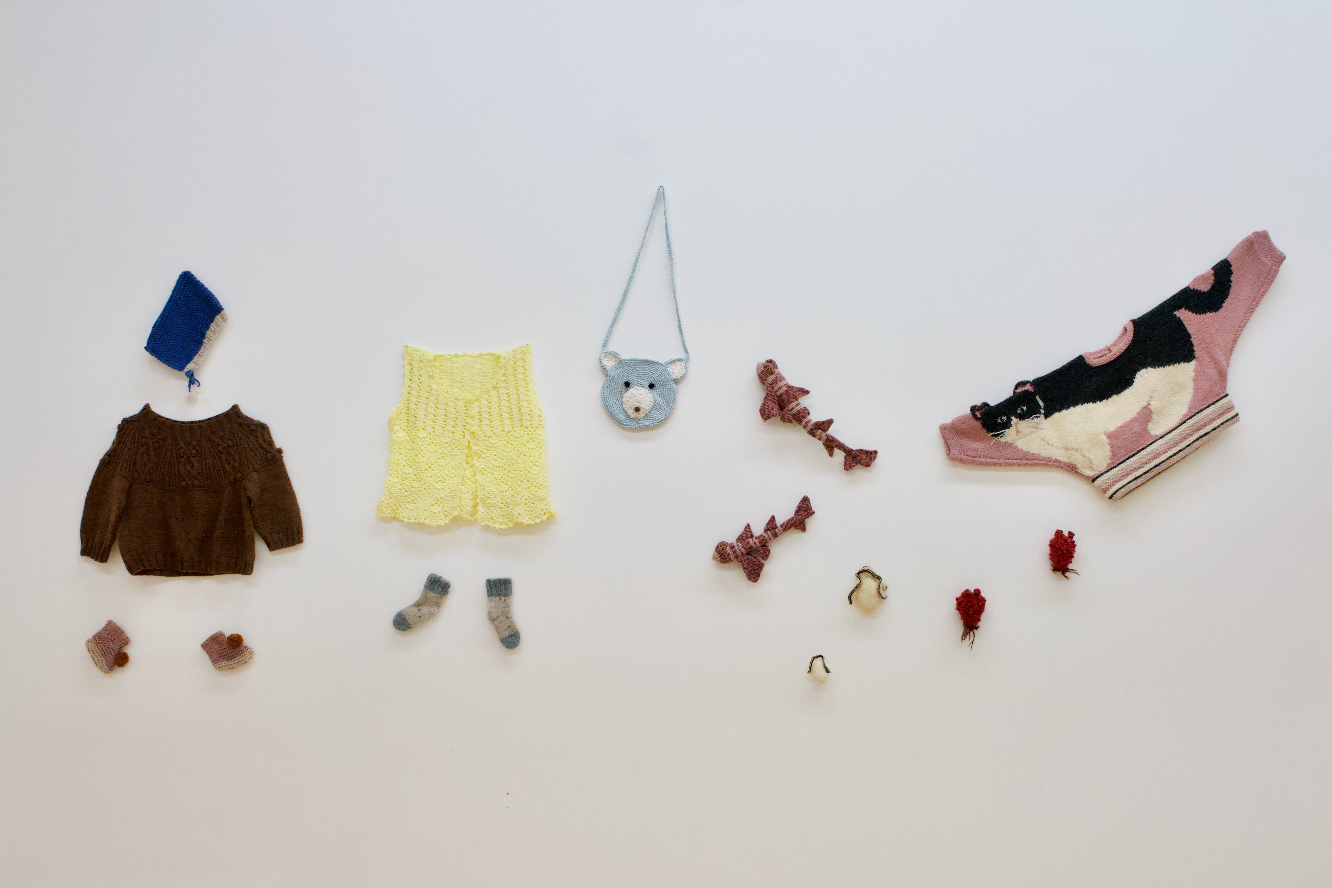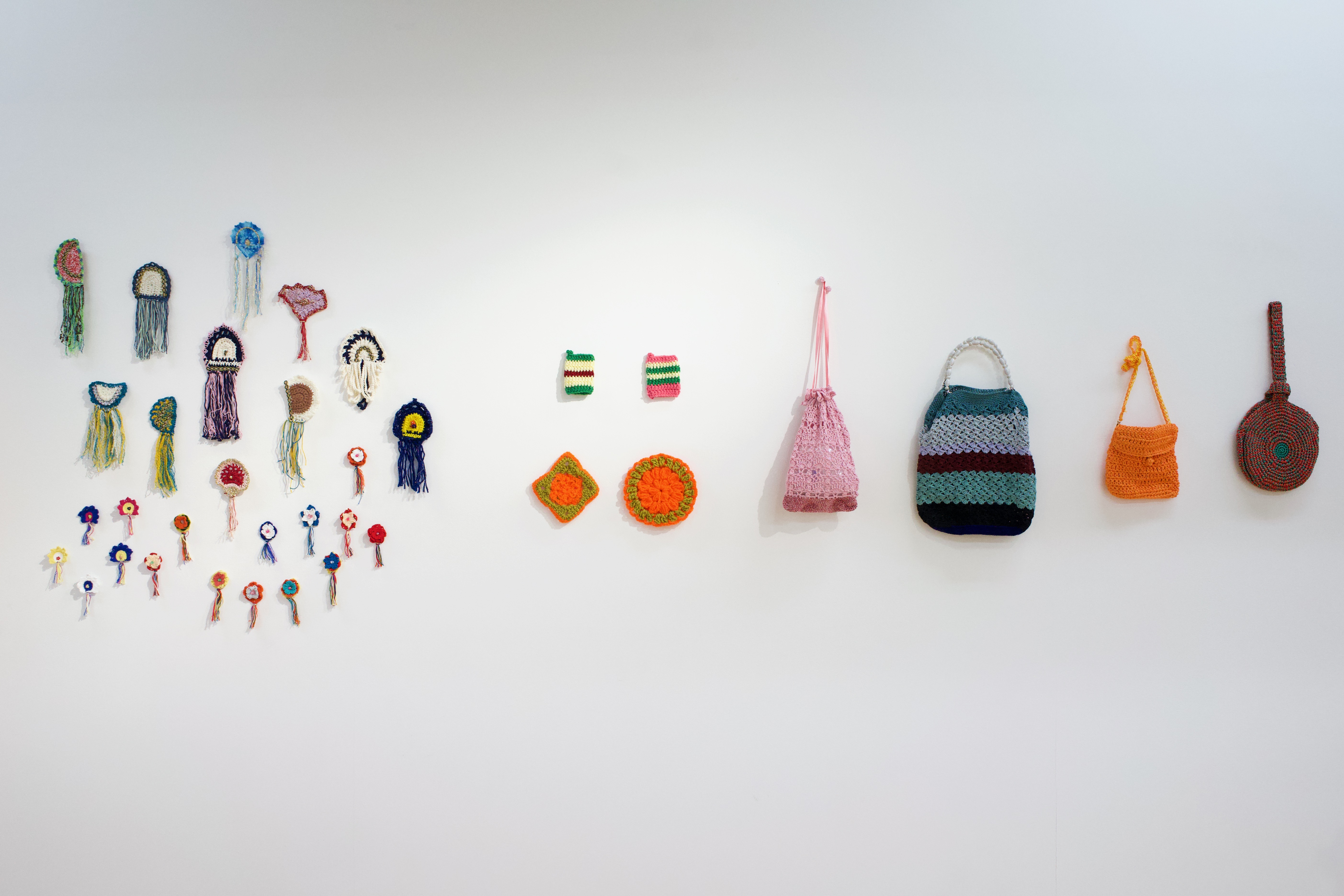 ニット、テキスタイル、改造した家庭用電子編み機、手芸などの技法で作品を制作。